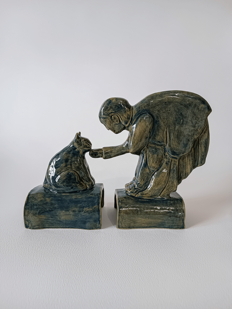 Either side of a doorway into the daylight, Lady and Fa Mao are the welcome chimes waiting to greet you – immediately, you are in between a moment of affection: the touch of a small ceramic crouching lady exhibited high on the left and her little cat sitting on the right. The shine of these cool glazed objects like windowsill ornaments in your grandmother’s living room evoke the sound of her analogue clock ticking in the background. Peeking down from their shelves they are the ceramic relics in an old antique shop, with a dusty quietness and the smell of carpet, and your mind wanders to where they came from and you’ll never know. Her tender fingertips and the cat’s soft chin separated by an entrance but always touching, always in love.