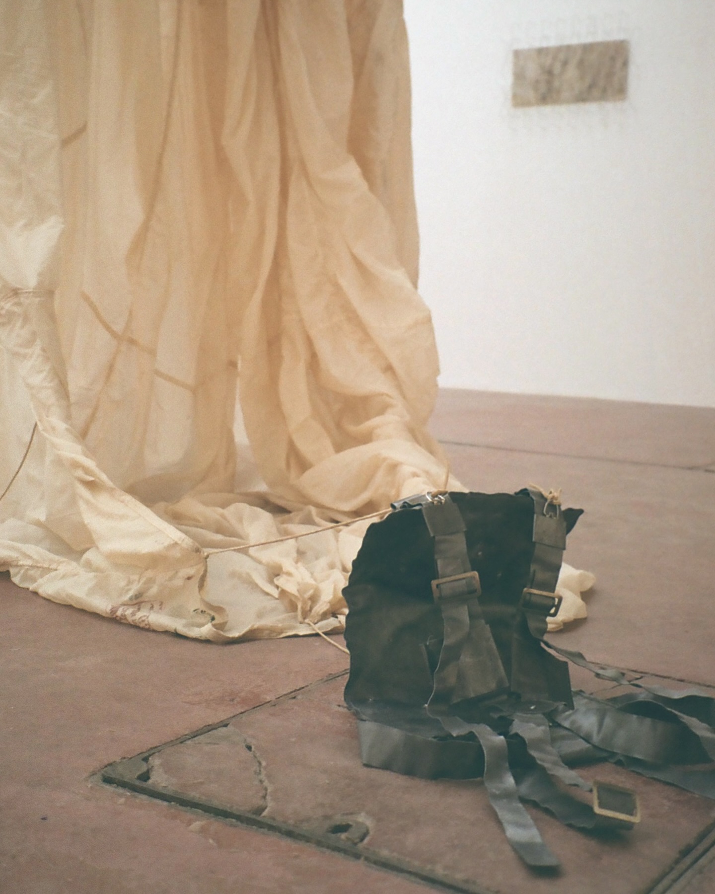 In the heart of this room, a large swathe of skin fabric drapes over a ceiling frame like it’s been hung out to dry. Closer, it is a parachute – anchored down by a lead vest slumped lifelessly on the floor. What visitor sailed in here, and where did they go?