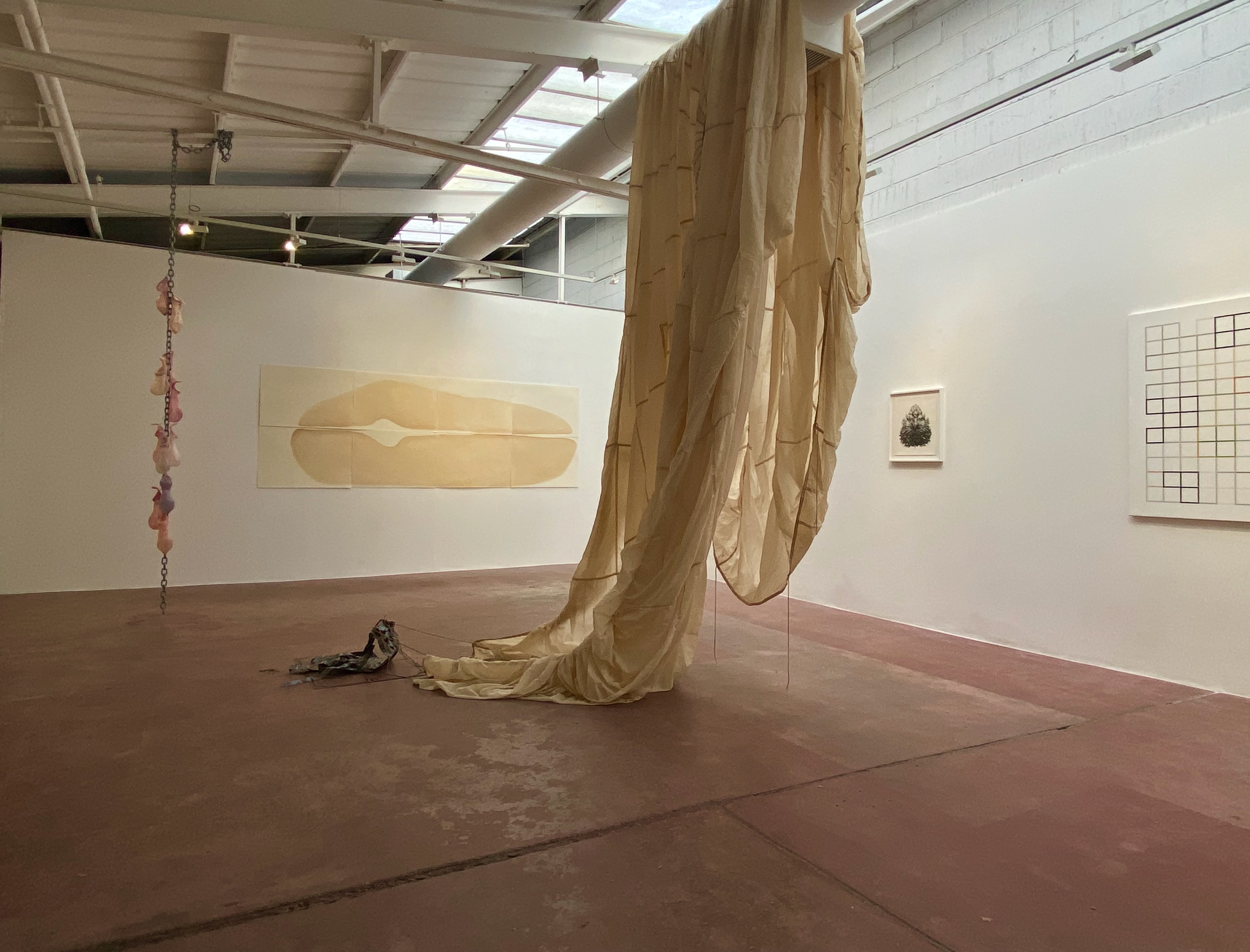 Anchored Descent tells us of some lone drifter strayed off course who has found their way here, in through the skylight, and rested on a pipe like a pausing butterfly. Echoing just behind, a sandy-hued pastel imprint by Ya Luo pieces together eight smooth sheets of paper to represent a large cell-like drawing that might otherwise be a bodily print left in the sand or some curious natural rock formation carved and smoothed by the sea. Nearby, a small puddle of water is forming underneath Georgia Salmond’s silicone chain of balloony foxgloves. These morning-coloured swelling cups drip down into the concrete with some form of generosity and slumber.