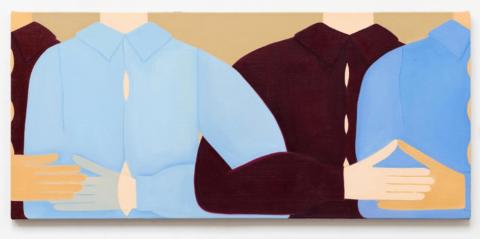 Further in, two tempting paintings are Ellie MacGarry’s Saturday and Yujin Jung’s I think we are being a cake. Both show us groups of people anonymous enough to be one person multiplied (and maybe that’s the point). They are all holding hands, demonstrating that though they are unknown to us, they know each other well – their respective canvas communities linking and clinking like chains never-ending. One of Saturday’s hands is fading away, and I find myself hoping she doesn’t go, for she fits into that space so well.