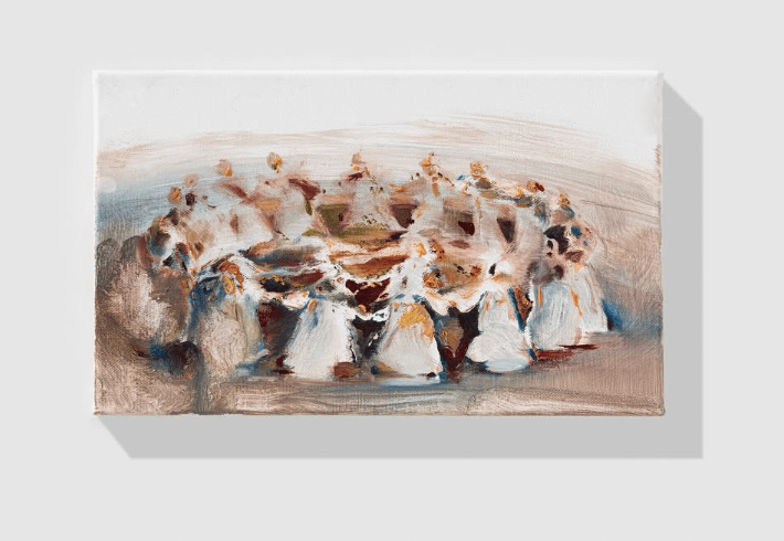 There is a conflict here between closeness and distance: a longing search for meaning and a more familiar pattern of routine, the ever-growing distance between an idea and its action that is somehow always out of reach. I think we are being a cake is a group of dancers in birthday-cake dresses, spinning in the mystique of it all. Her lurid colours of deep teal and wine-red bleed through like splatters in a blurred vision; I wonder if this is some unsure memory, or an image of a future where one of us can bleed freely into the next like these inky stains, where our intimacies can be shared, grouped.